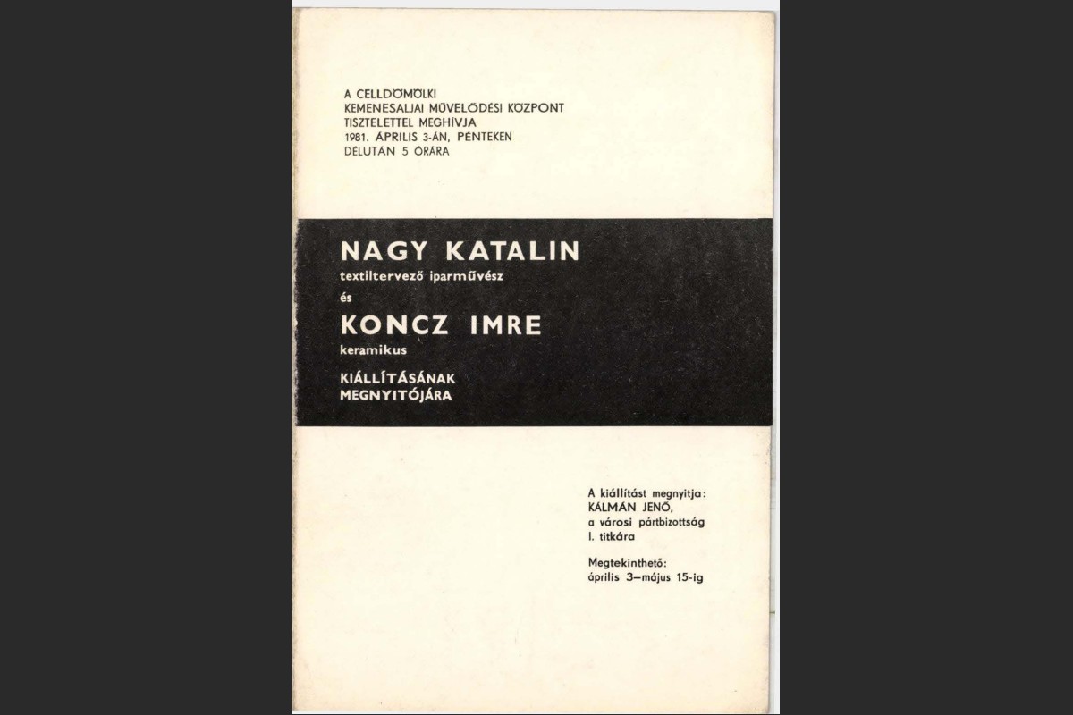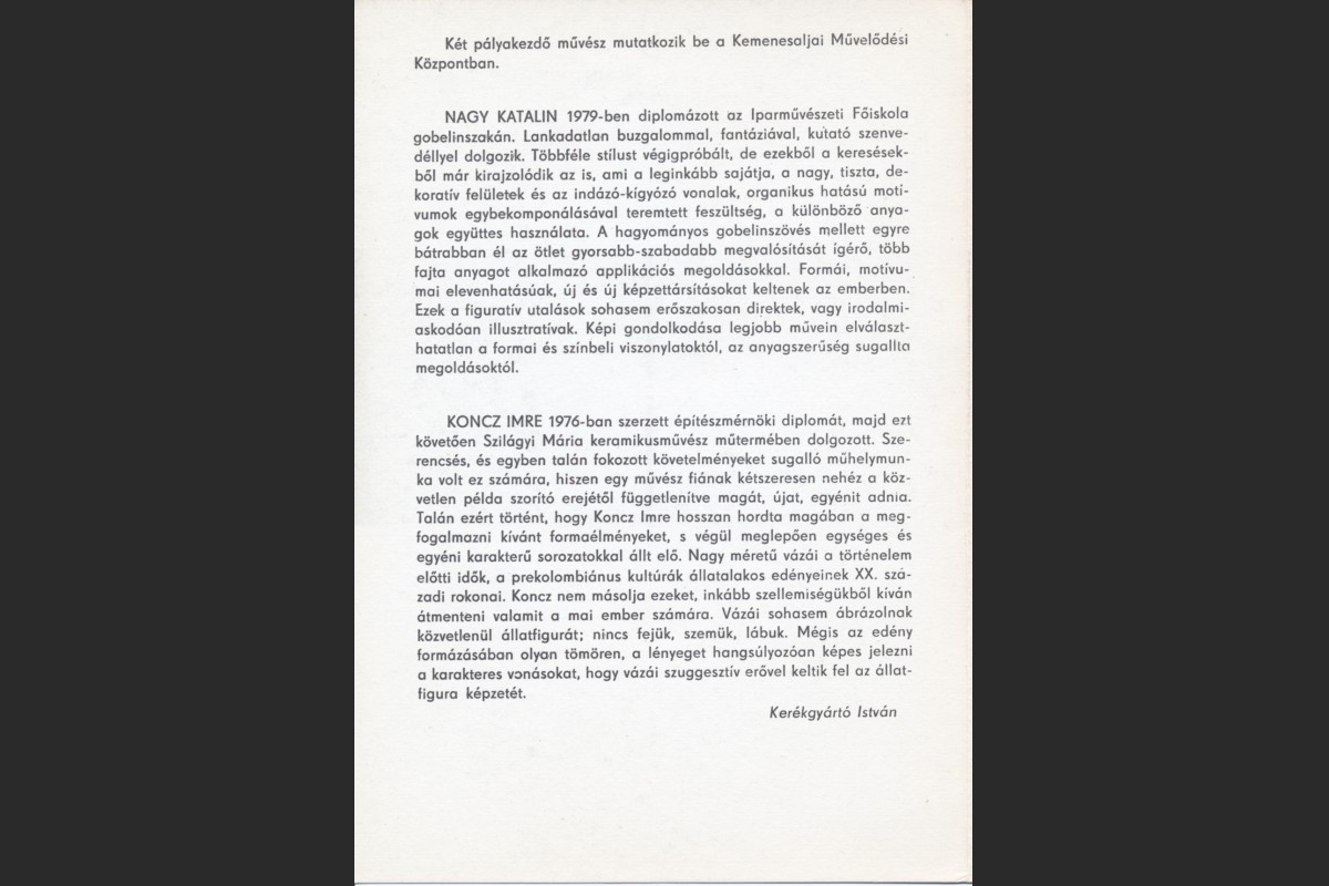 Nagy Katalinnak és Koncz Imrének azt kívánom, hogy művészi pályájuk legyen töretlen. Bízunk abban, hogy ez a mai kiállítás hozzá segíti őket ahhoz, hogy alkotómunkájukban még markánsabban tudják önmagukat nyújtani. Alkossanak minél több szépet, műveik mint díszítőtárgyak sok irányban szolgálják az emberek ízlésének fejlődését, általános műveltségük gyarapodását.