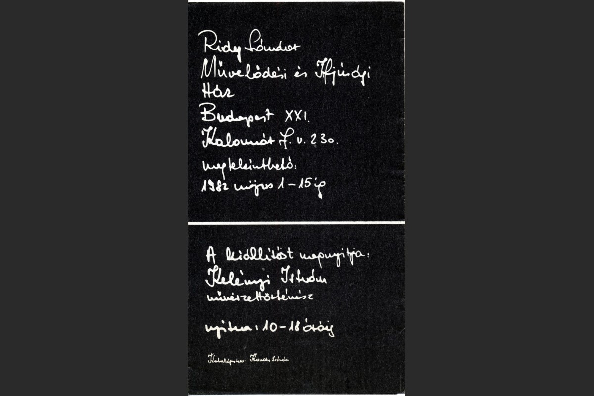 Rideg Sándor Művelődési és Ifjúsági Ház, Budapest, Csepel1982. május 1–15.Megnyitó: Kelényi István művészettörténész Meghívó «»